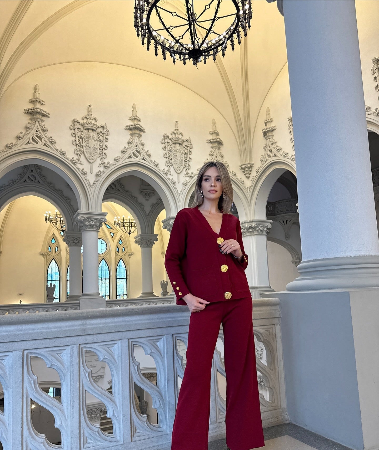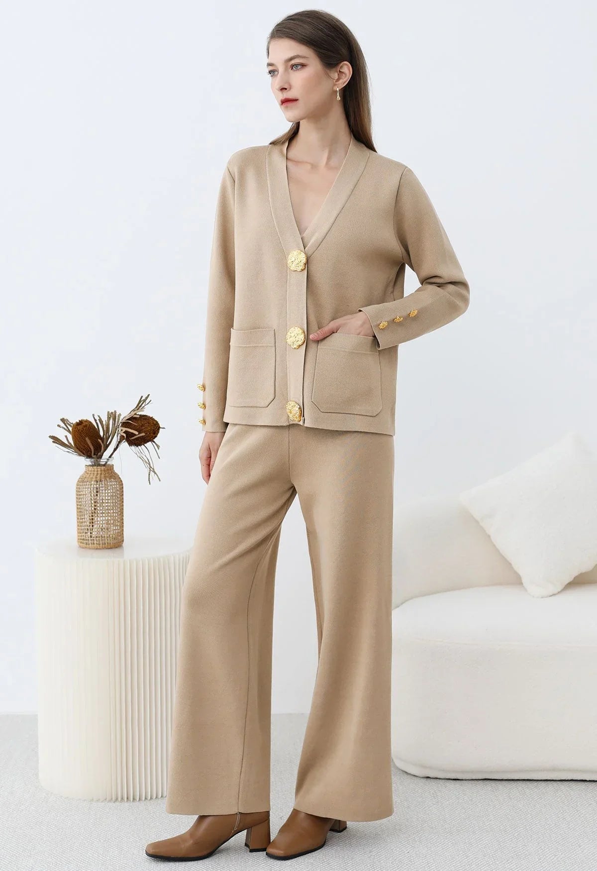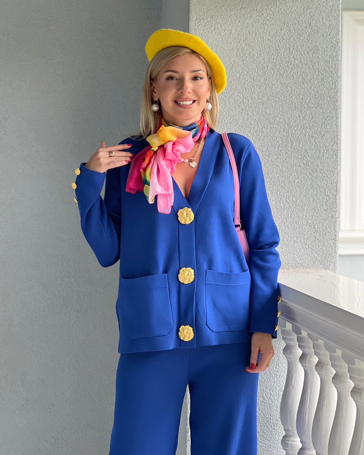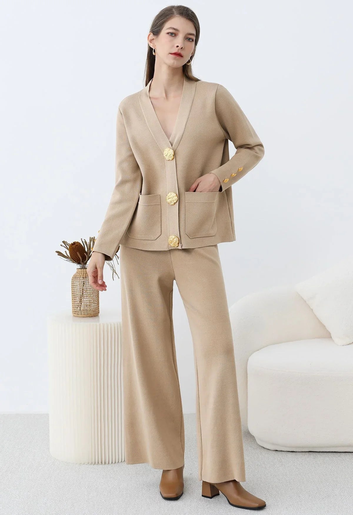 Show off understated luxury with this knitted cardigan and pants set, designed to combine refinement and comfort. Its sophisticated design, embellished with gold buttons and patch pockets, brings a chic and timeless touch to your wardrobe.
