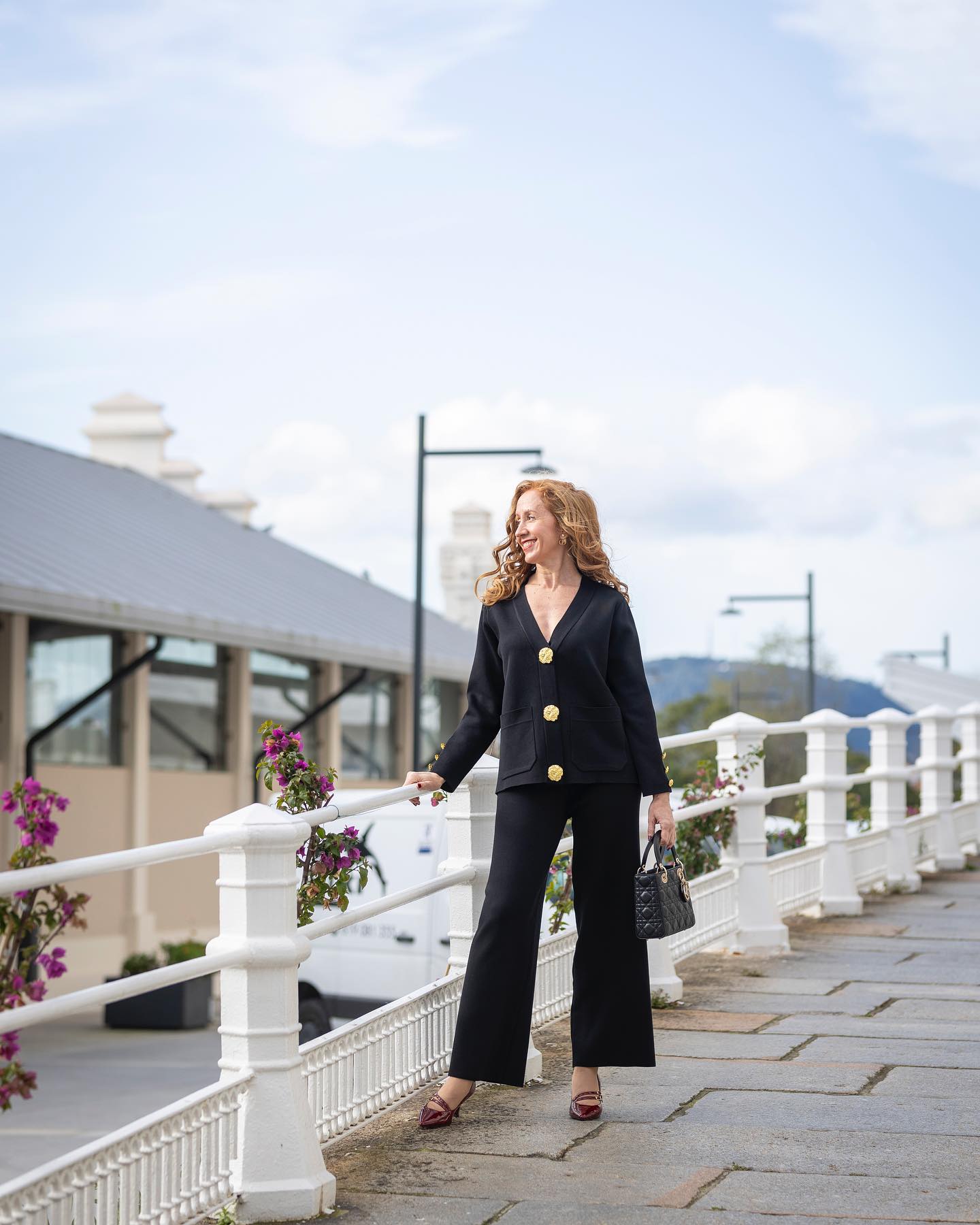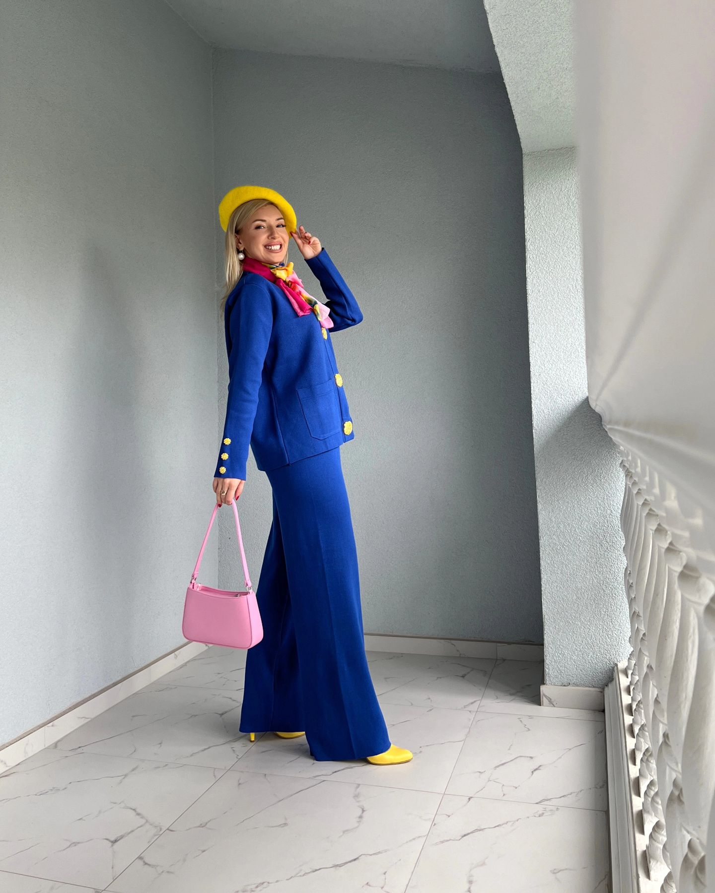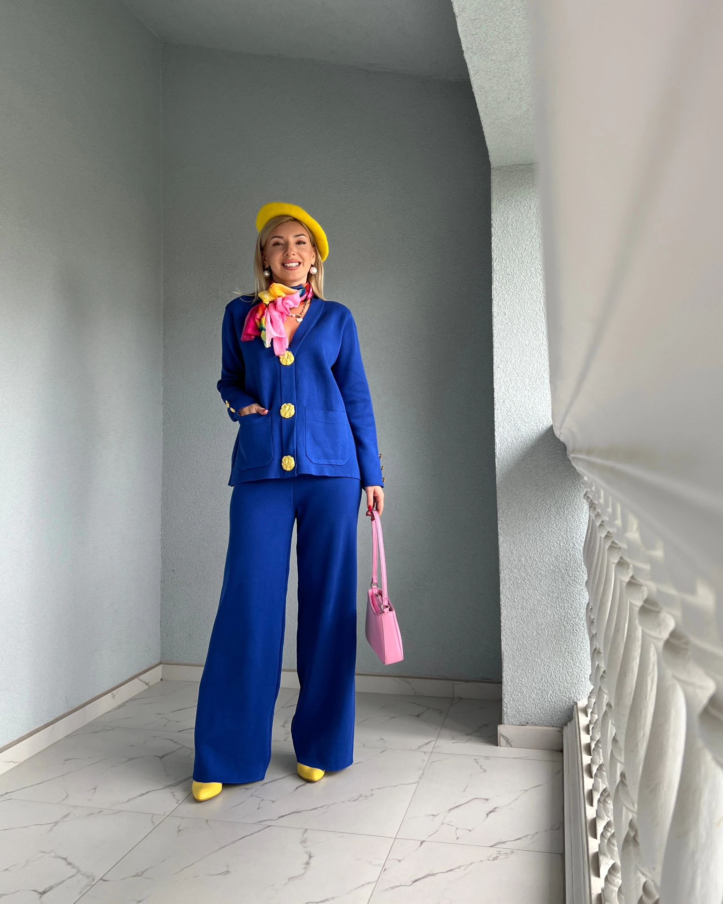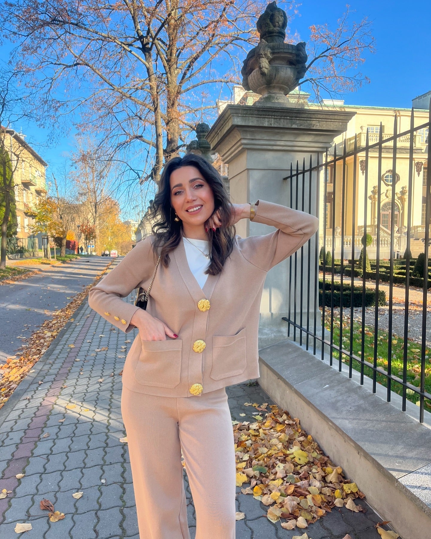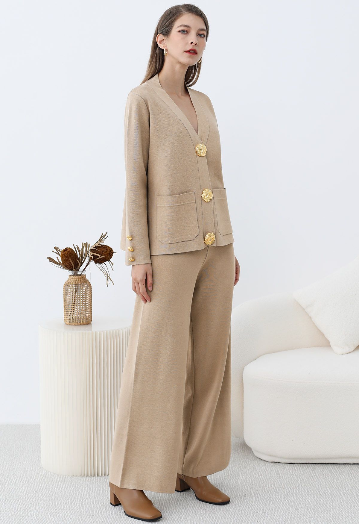 Show off understated luxury with this knitted cardigan and pants set, designed to combine refinement and comfort. Its sophisticated design, embellished with gold buttons and patch pockets, brings a chic and timeless touch to your wardrobe.