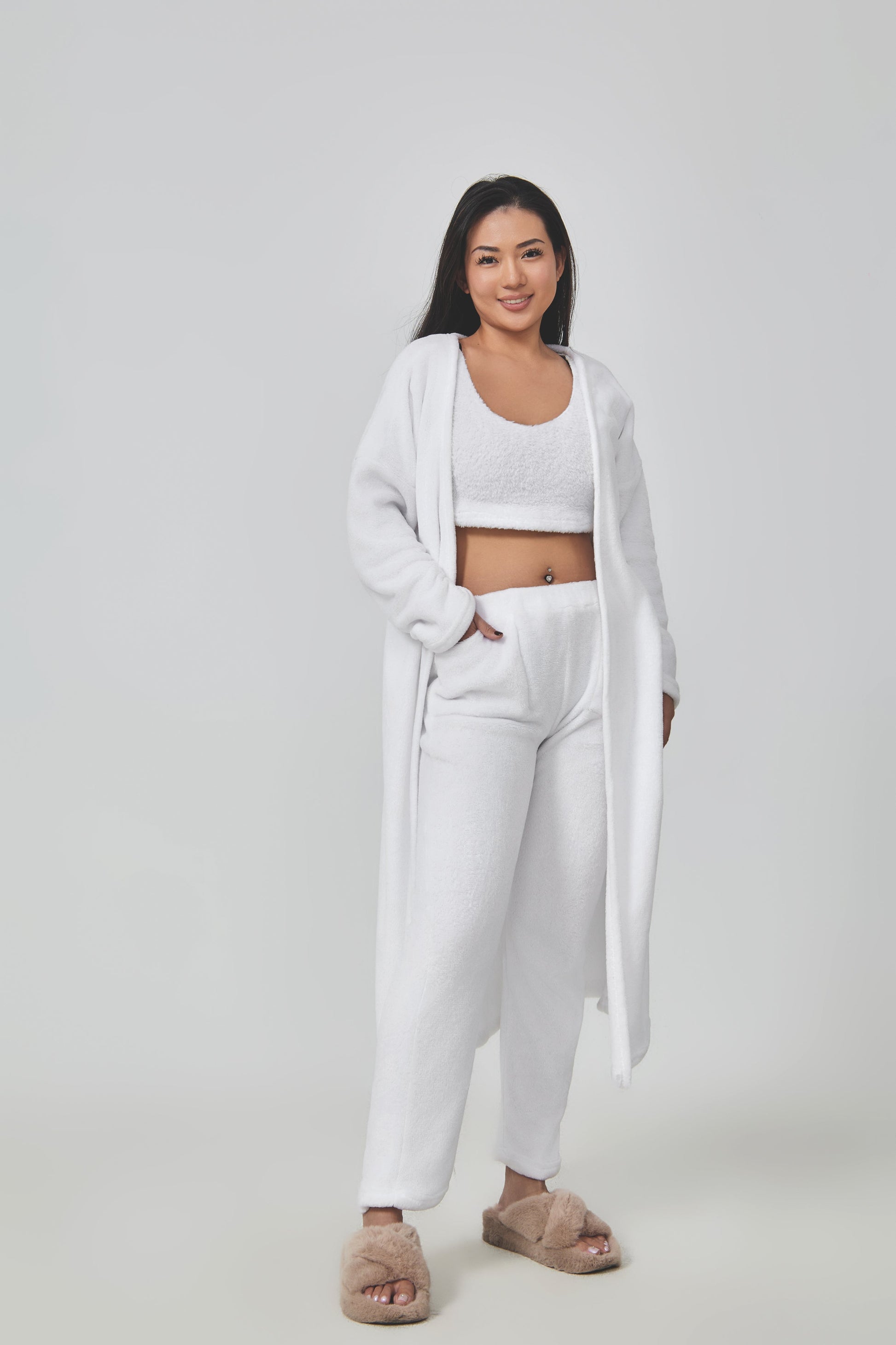 The Shobi 3-Piece Set is designed to provide warmth and style on cold days. Featuring a crop top, wide-leg pants, and a mid-length cardigan, it combines softness and modernity for a look that's both cozy and refined.